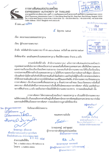 72024-06-26 00:00:00.00000001.000.00การทางพิเศษแห่งประเทศไทย แจ้งว่าถนนสรรพาวุธซอย 2 (เลียบด่วน) อยู่ในพื้นที่เขตทางโครงการทางพิเศษเฉลิมมหานคร (สายบางนา-ท่าเรือ) และกรรมสิทธิ์ที่ดินเป็นของการทางพิเศษ (ผู้ค้าจำนวน 14 ราย)