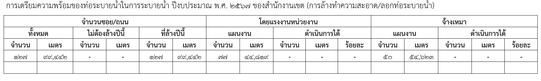 222024-05-16 00:00:00.00000000.000.00ผลการดำเนินการล้างทำความสะอาดท่อระบายน้ำ ประจำเดือนพฤษภาคม 2567 ดำเนินการตามเเผน 50 ซอย ความยาว 54,623 เมตร เเต่เนื่องจากมีการปรับปรุงถนนจำนวน 2 ซอย คือ ซอยอ่อนนุช 66 (โมราวรรณ 2) เเละซอยอ่อนนุช 39 (ซอยอนามัย) ทำให้ไม่ต้องดำเนินการในส่วนนี้ ดังนั้น ผลดำเนินการเเล้วเสร็จ จำนวน 48 ซอย ความยาว 52,573 เมตร คิดเป็นร้อยละ 100