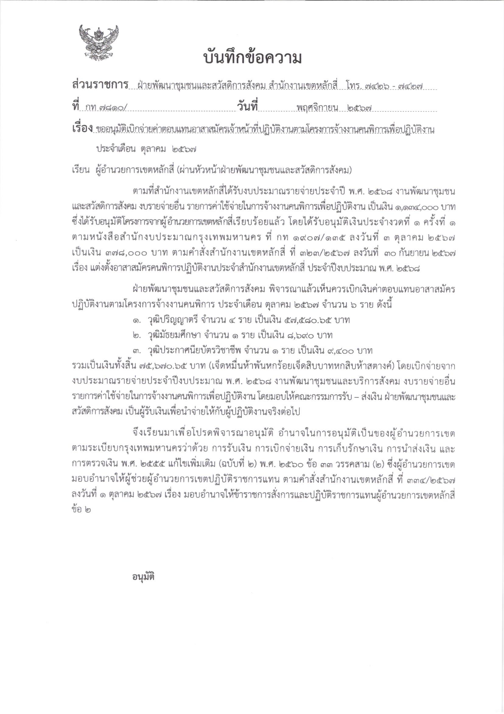 | 99 | ![]() | 2024-10-31 00:00:00.0000000 | 8.00 | 0.00 | ได้ดำเนินการจัดทำฎีกาเบิกจ่ายค่าตอบแทนอาสาสมัครคนพิการและเบิกจ่ายเงินกองทุนประกันสังคมอาสาสมัครโครงการจ้างงานคนพิการ ประจำเดือน ตุลาคม 2567 เสร็จสิ้นเรียบร้อยแล้ว |