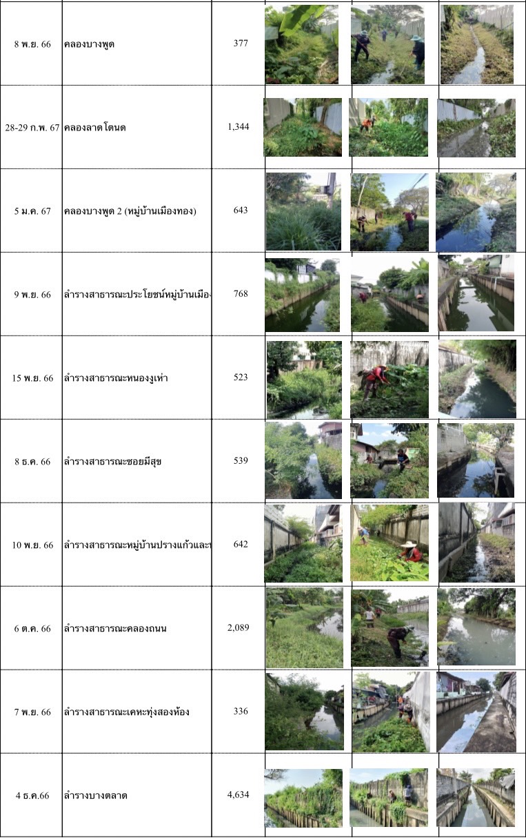 232024-04-03 00:00:00.000000013.920.00เปิดทางน้ำไหล 1.วันที่ 8 พฤศจิกายน 2566 คลองบางพูด ความยาว 377 เมตร 2.วันที่ 28-29 กุมภาพันธ์ 2567 คลองลาดโตนด ความยาว 1,344 เมตร 3.วันที่ 5 มกราคม 2567 คลองบางพูด2 (หมู่บ้านเมืองทอง) ความยาว 643 เมตร 4.วันที่ 9 พฤศจิกายน 2566 ลำรางสาธารณะประโยชน์หมู่บ้านเมือง ความยาว 768 เมตร 5.วันที่ 15 พฤศจิกายน 2566 ลำรางคลองสาธารณะหนองงูเห่า ความยาว 523 เมตร 6.วันที่ 8 ธันวาคม 2566 ลำรางสาธารณะซอยมีสุข ความยาว 539 เมตร 7.วันที่ 10 พฤศจิกายน 2566 ลำรางสาธารณะหมู่บ้านปรางแก้วและหมู่บ้านเศรณีปาร์ค ความยาว 642 เมตร 8.วันที่ 6 ตุลาคม 2566 ลำรางสาธารณะคลองถนน ความยาว 2,089 เมตร 9.วันที่ 7 พฤศจิกายน 2566 ลำรางสาธารณะเคหะทุ่งสองห้อง ความยาว 336 เมตร 10.วันที่ 4 ธันวาคม 2566 ลำรางบางตลาด ความยาว 4,634 เมตร รวมความยาว 11,895 เมตร